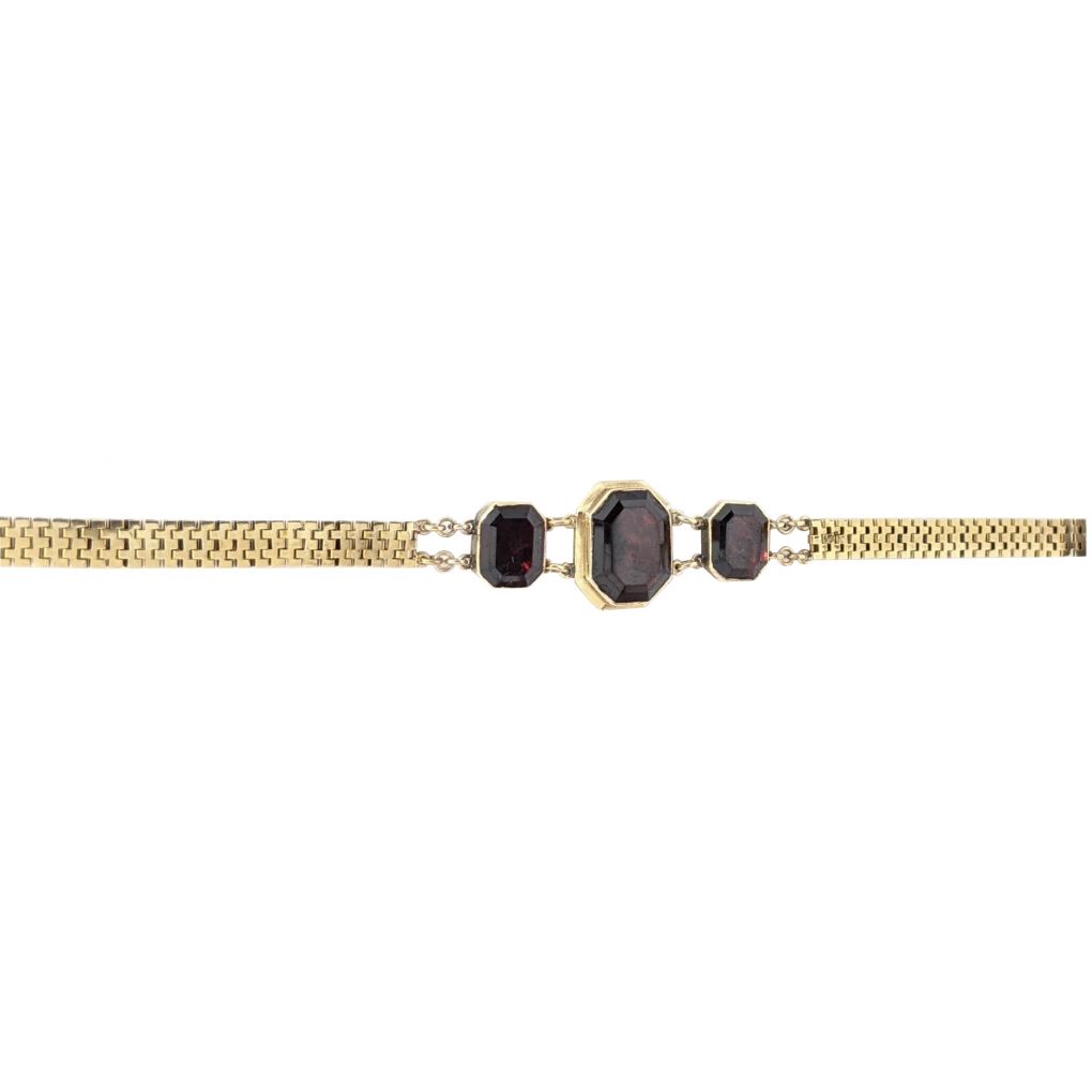 Lovely vintage style 14kt yellow gold Garnet bracelet set with three emerald cut garnet stones.The Garnets measure 14mm x10mm for the centre stone and each side stone measures 9mm x 7mm.Total carat weight for the garnet stones are approximately 10cts.The length of thhe bracelet is 6 1/2 inches.