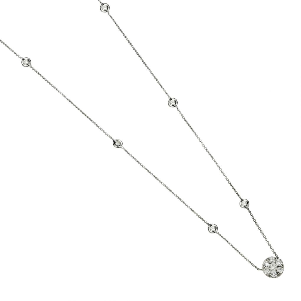 Ladies 18kt white gold Roberto Coin cluster pendant necklace featuring approximately 0.30 carat total weight of diamonds in the cluster pendant. Further enhanced by diamonds on the white gold chain weighing 0.35 carat total weight. Necklace can be worn at 16 or 18" in length.