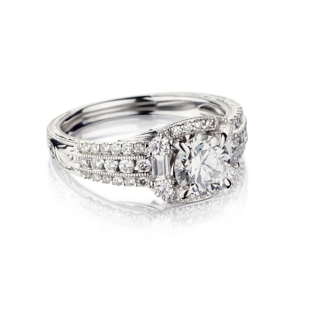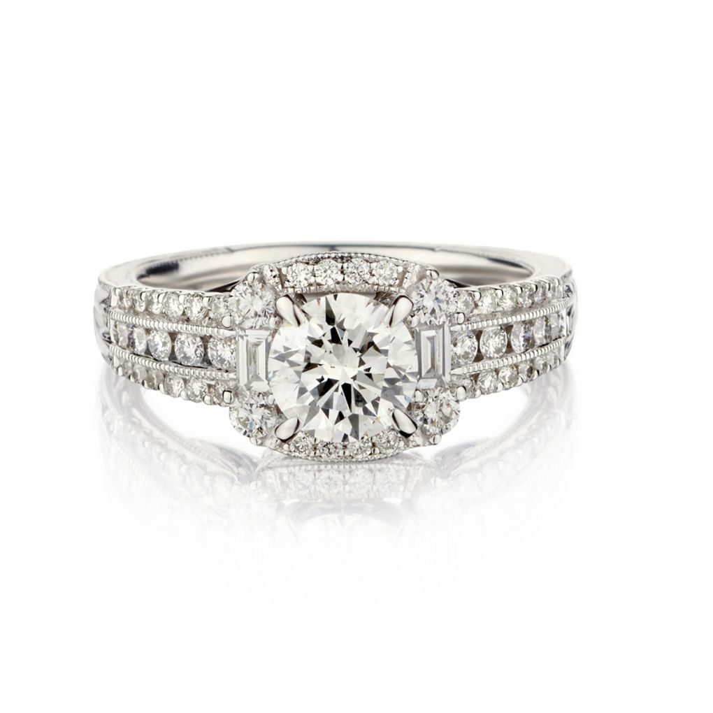 Ladies beautiful 18kt white gold diamond halo-set ring featuring a 0.90 carat Round Brilliant cut diamond of (SI-2) in clarity and (I-J) in color. The center stone is surrounded by Round Brilliant cut diamonds as well as (2) Baguette-cut diamonds of (VS-SI) in clarity and (G) in color. Shank has beautiful filigree work down the sides and milled edge. Measurements: 9mm x 10mm x 6mm. Currently a finger size 6 but can be resized.