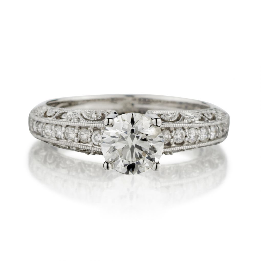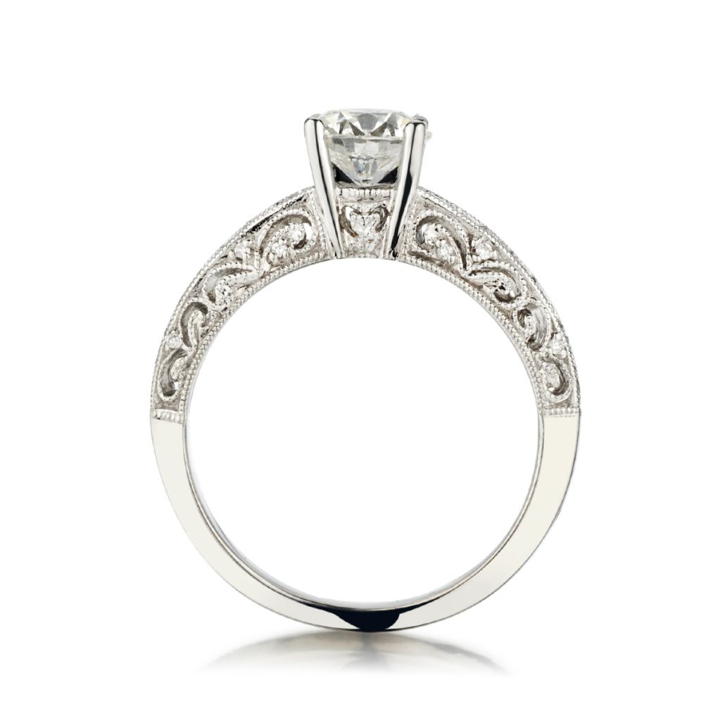 Ladies 18kt white gold diamond engagement ring featuring a 1.04 carat Round Brilliant cut diamond of (I-1) in clarity and (G) in color. Further enhanced by 16 round brilliant cut diamonds weighing 0.32 carat total weight. Filigree work. Size 7. Can be resized.