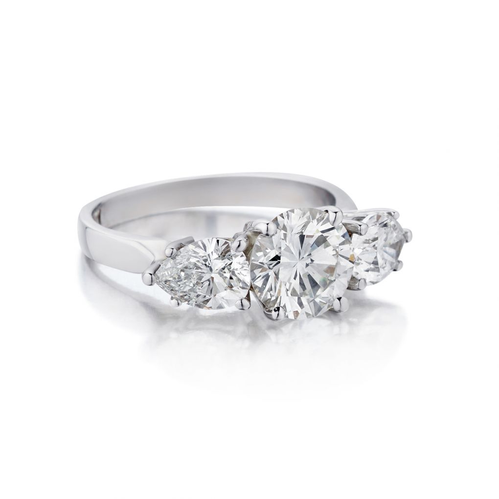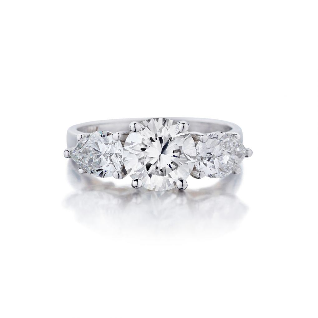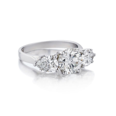 Ladies 14kt white gold 3-stone diamond ring featuring a 1.55 carat Round Brilliant cut diamond of (SI-1) in clarity and (H) in color; flanked between (2) Pear-shaped diamonds weighing 1.50 carat total weight of (SI) in clarity and (H-I) in color. Currently a finger size 6 but can be resized.