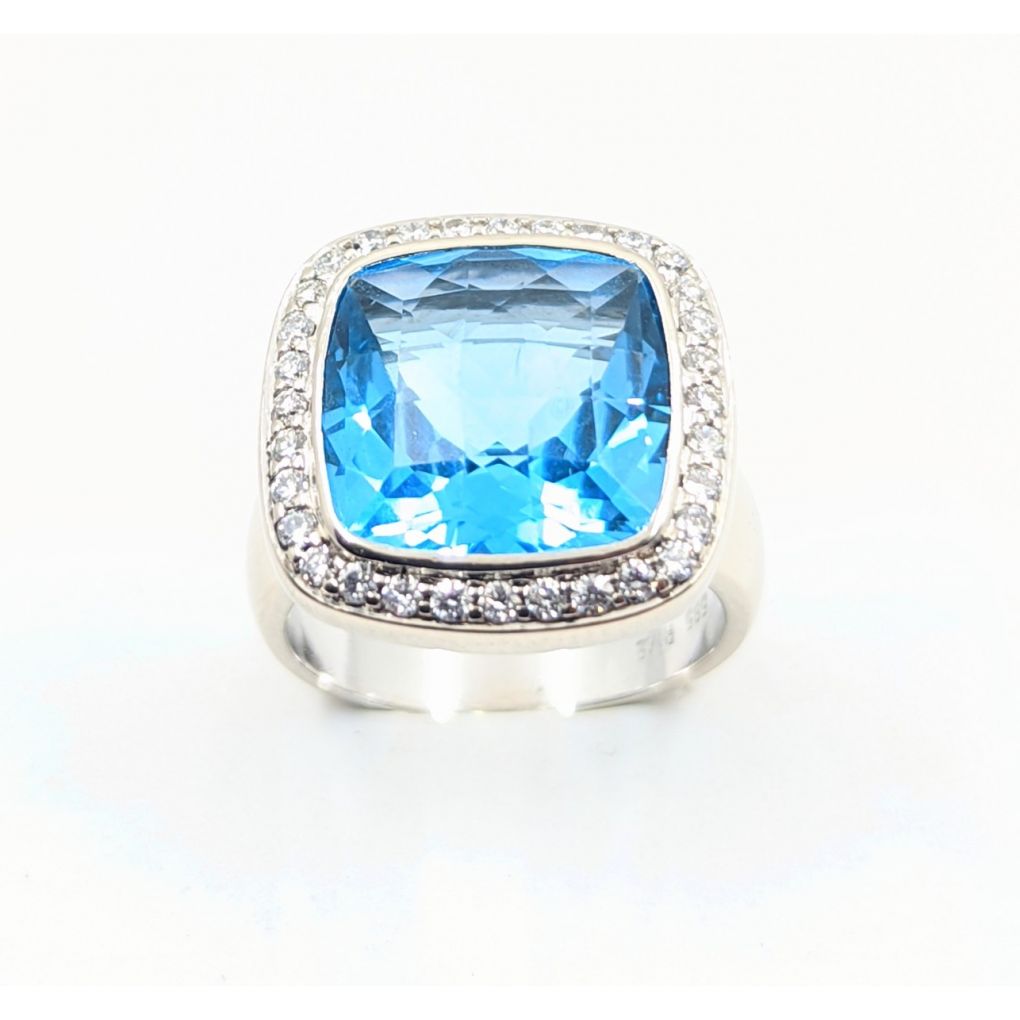 Striking multi faceted cusion cut Swiss blue Topaz ring.The Topaz measures 13mm x13mm. There are 32 round modern brilliant cut diamonds having a total carat weight of 0.65ct.The ring is a size 7 and can be sized larger or smaller.