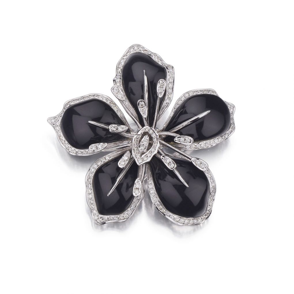 • 14KT White Gold Onyx And Diamond Flower Brooch/Pendant