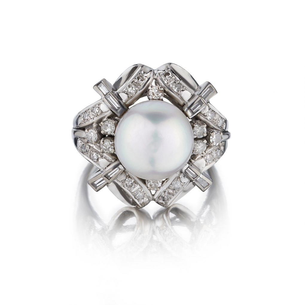 • 14KT White Gold Pearl And Diamond Mid-Century Ring