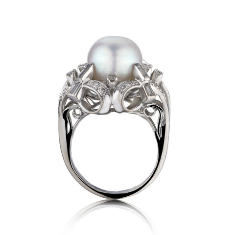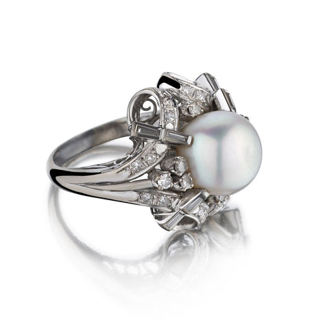 14KT White Gold Pearl And Diamond Mid-Century Ring