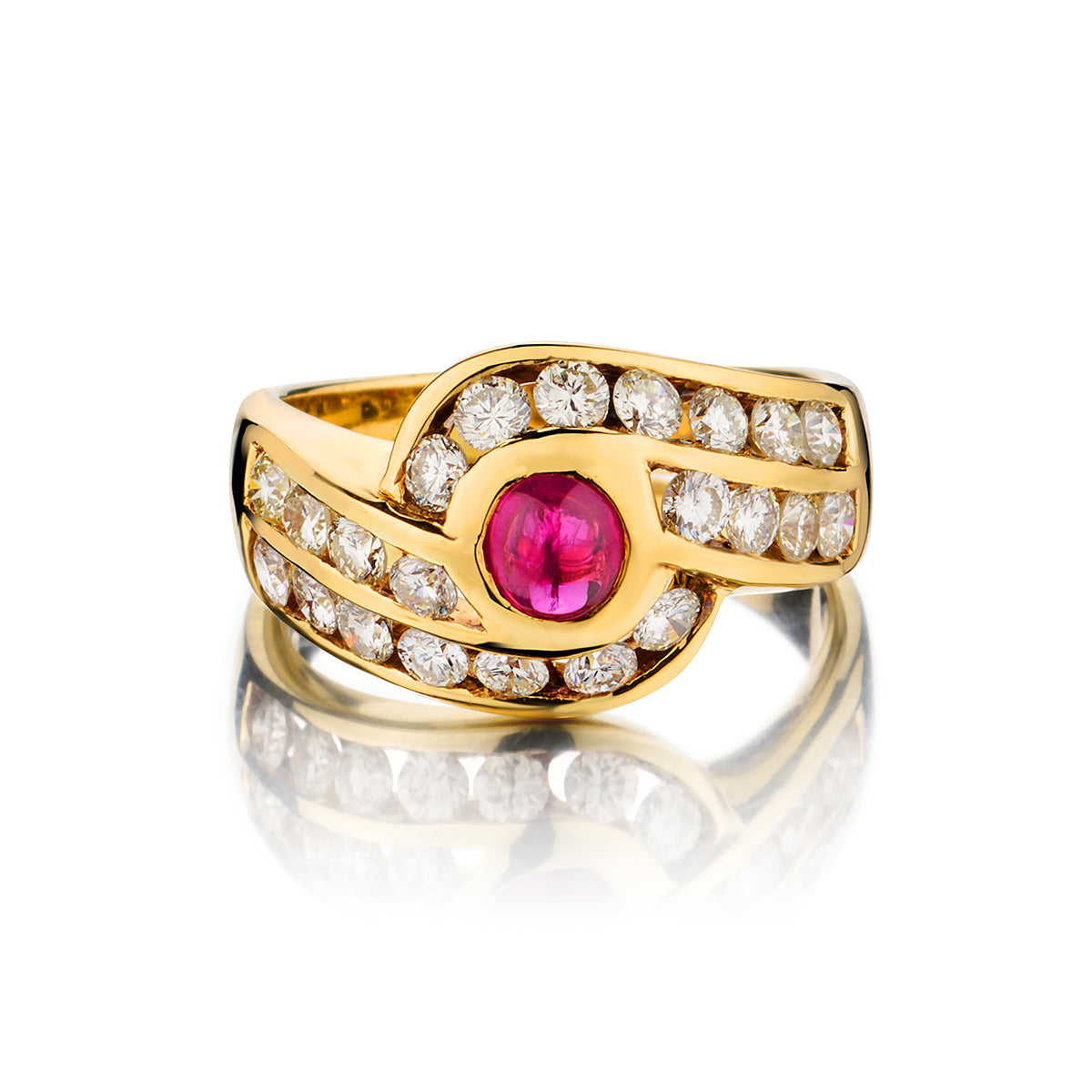 14kt Yellow gold Ruby and diamond ring. This ring features a round Cabochon Ruby weighing 0.30 carat weight. It is surrounded by a yellow gold double swirl design surrounding the Ruby. These swirls are set with 22 x 1.30 total carat weight of brilliant cut diamonds. Channel setting. Current finger size: 7-1/2. This ring can be resized.