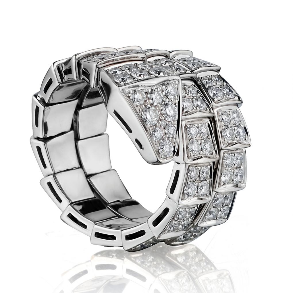 Ladies 18kt white gold and diamond custom made "Serpentine" flexible ring featuring 3.00 carat total with Brilliant cut diamonds of (VS) in clarity and (F-G) in color. 20mm(W).Currently a size 7. This ring cannot be resized