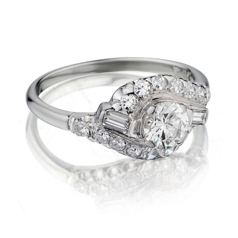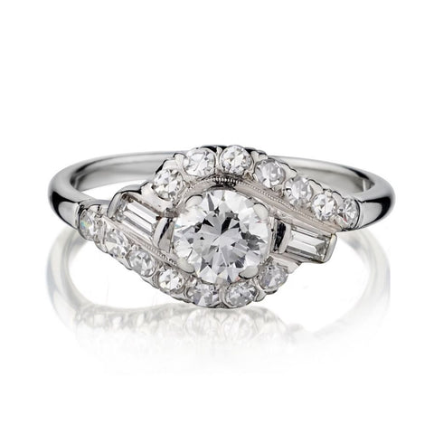 Ladies vintage 18Kt white gold and diamond ring featuring a European cut diamond weighing 0.50 carat weight of (VS) in clarity and (G) in color. Surrounded by 16 x 0.50carat total weight of Baguette and Brilliant cut diamonds. Finger size is 5. This ring can be resized.