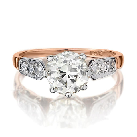 Ladies vintage platinum and 18kt rose gold Victorian era engagement ring featuring a 2.00 carat Old-Mine cut diamond of (VS) in clarity and (K-L) in color. Further enhanced by 6 x 0.24 carat total weight of Old-Mine cut diamonds. Currently a finger size 6 3/4 but can be resized.