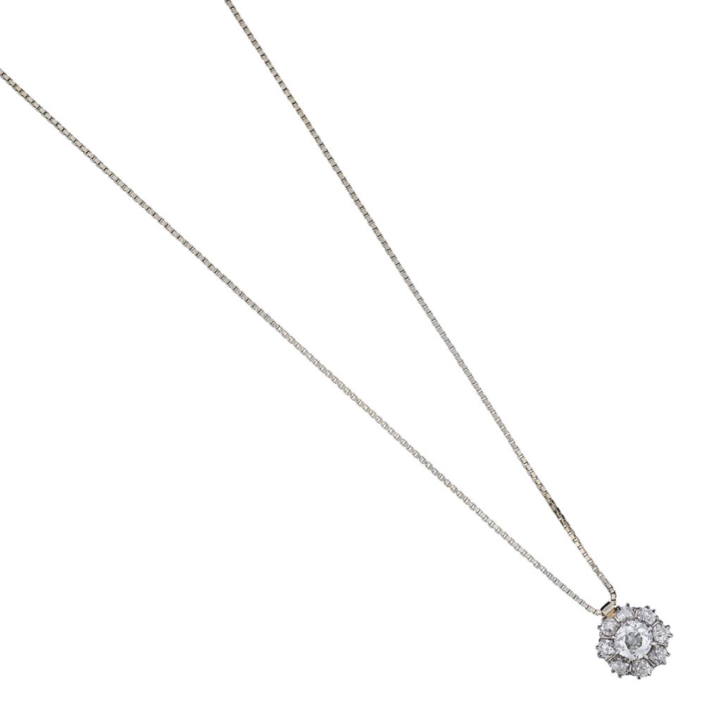 Ladies Victorian era platinum topped on 18kt yellow gold cluster pendant centering a 1.10 carat Old-European cut diamond of (SI) in clarity and (J-K) in color. The center stone is enhanced by a halo of (8) old-mine cut diamonds weighing approximately 1.20 carat total weight. 13mm round. Featured on a 14kt white gold box chain that is 14 1/2" long.