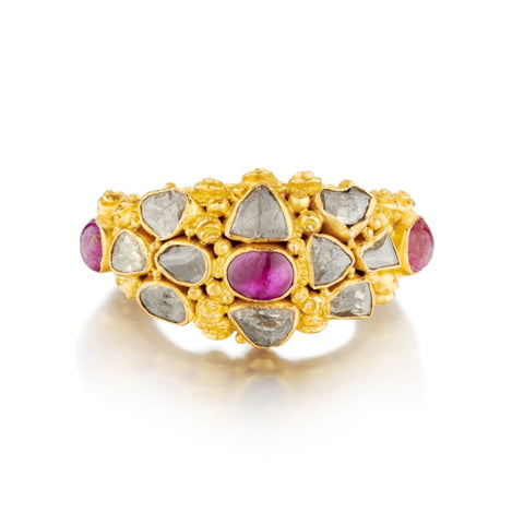 • 22Kt Yellow Gold Custom Made, Rose Cut Diamond and Ruby Ring. Vintage Inspired. One of a Kind