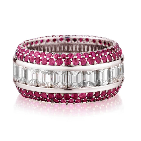 6.70 Tw Emerald Cut Diamond and Ruby Eternity Band.