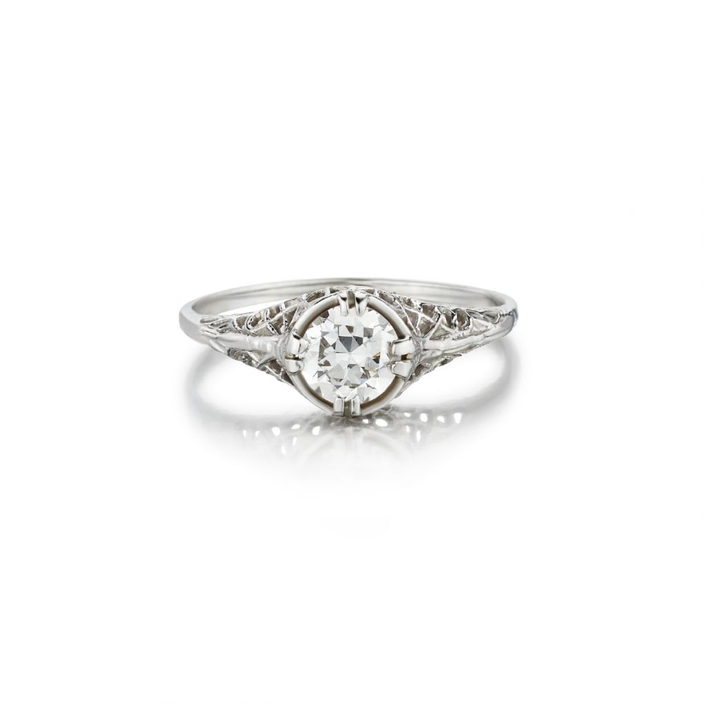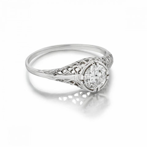 Ladies 18kt white gold diamond art-deco engagement ring featuring a 0.64 carat Old-European cut diamond of (SI1) in clarity and (H) in color. Further enhanced with beautiful filigree. Currently a finger size 6 3/4 but can be resized. Circa 1930's.