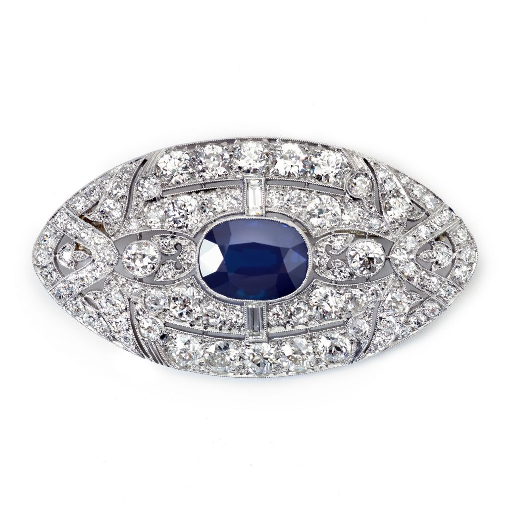 • Art-Deco Blue Sapphire & Old-Cut Diamond Platinum Brooch