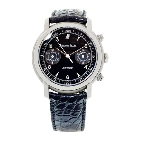 Gent's stainless steel Audemars Piguet "Jules Audemars" Automatic Chronograph wristwatch. 38.6 mm case. Solid black dial. Dicontinued. Reference #: 25859ST.
