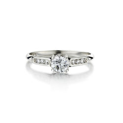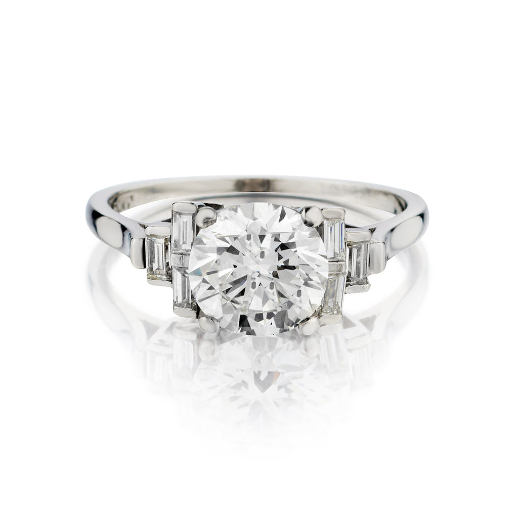 Platinum and diamond ring. This ring features a Brilliant cut diamond weighing 1.95 carat weight of (VS) in clarity and (F) in colour. Also containing 6 x 0.12 total carta weight of Baguette cut diamonds. Inside engraving circa 1962. Current finger size: 7-3/4. This ring can be resized.