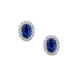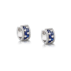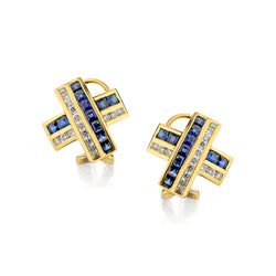 Ladies 14kt yellow gold Blue Sapphire and Diamond huggies. These earings consist of 2 x 1.30 total carat weight of Oval Blue Sapphires and 34 x 0.70 total carat weight of Brilliant cut diamonds. Measuring 17mm (L) x 12mm (W) at the top and tapering. Post and secure omega back closure. Weight: 7.07 grams.