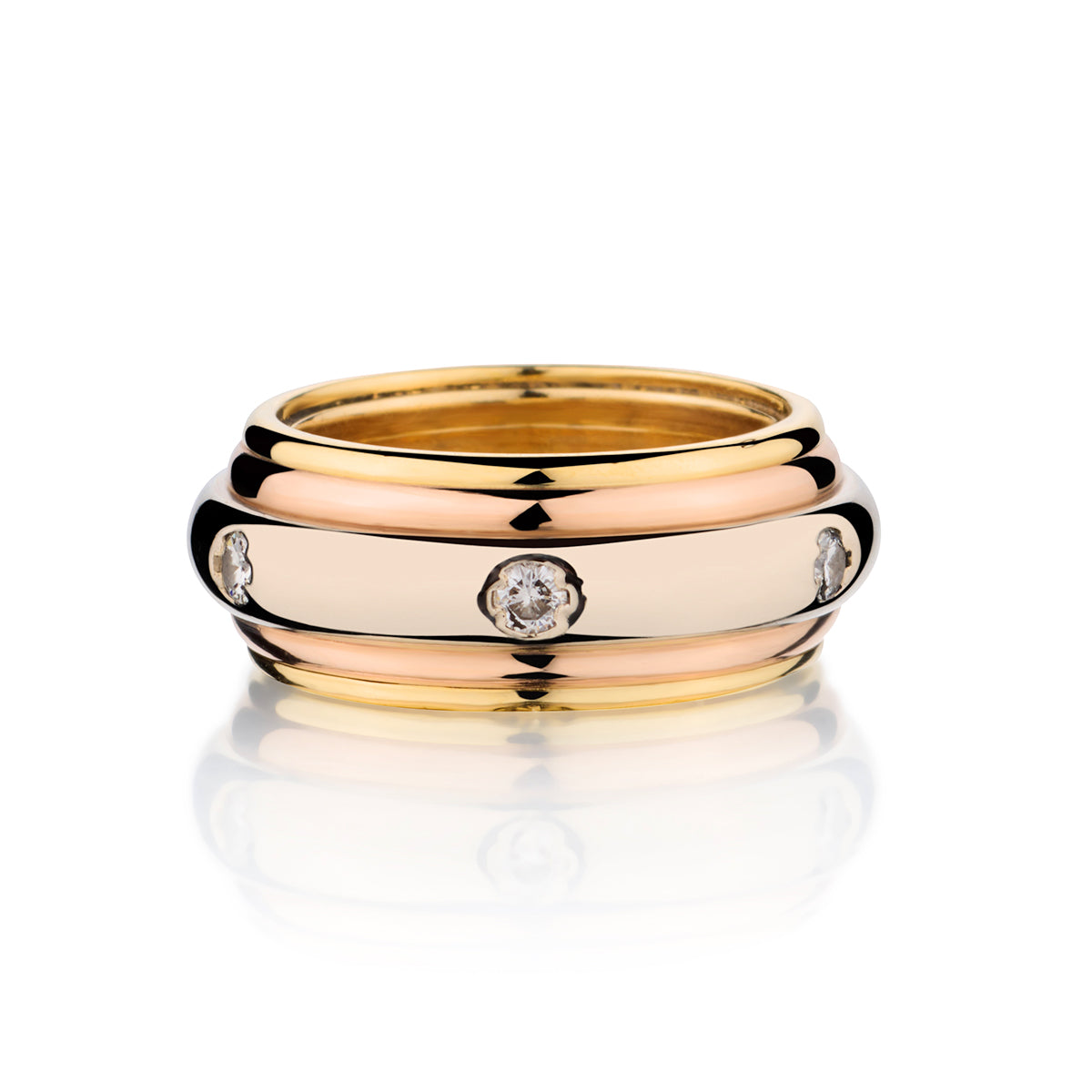 Cartier signed tri-colour "Saturn" diamond ring. This ring is set in 18kt yellow, white and rose gold. 9mm wide. This ring is set with 6 x 0.30 total carat weight of Brilliant cut diamonds. Circa 1990. Current size: (54) US 6. This ring cannot be resized. Weight: 14 grams.