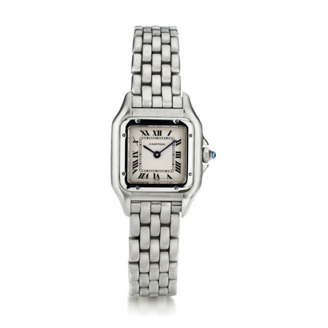 Ladies Cartier stainless steel Panther collection wristwatch. 23mm x 30mm case diameter. Cream dial with roman numeral hour markers. Stainless steel integrated panther bracelet. Solid caseback. Sapphire crystal. Quartz movement.
