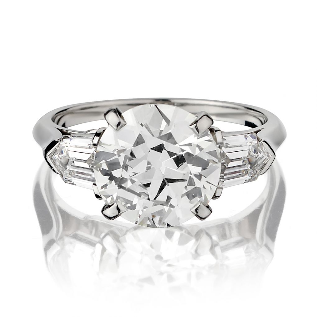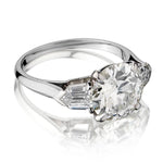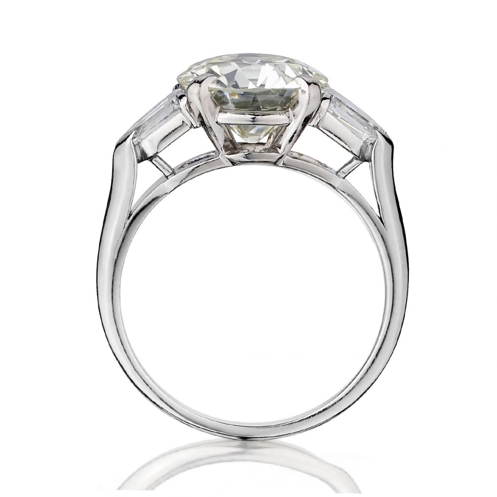 A magnificent Ladies Platinum Cartier vintage ring featuring a 3.80 carat European-cut diamond of (VS) in clarity and (J) in color. The center-stone is flanked by a bullet-shaped diamond on either side weighing approximately 1.50 total carat weight. Signed Cartier.
