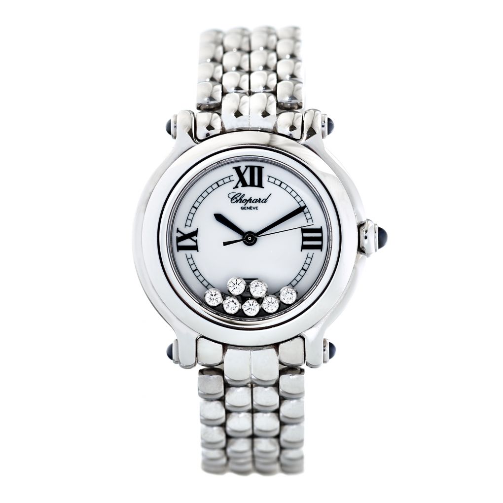 Ladies stainless steel Chopard Round Happy Sport wristwatch with seven floating diamonds on a white dial with roman numerals and date. Quartz movement. 30mm. Reference #: 278236-3005.