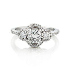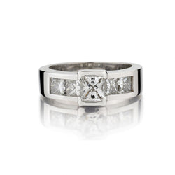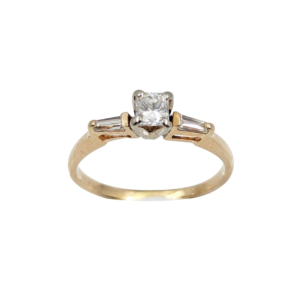 Ladies 14kt white gold diamond ring. This ring features a Princess cut diamond weighing 0.45 carat weight of (VS) in clarity and (J) in colour. Also featuring  2 x 0.12 total carat weight of Baguette  cut diamonds. Current  finger size: 6-1/2. This ring can be resized.