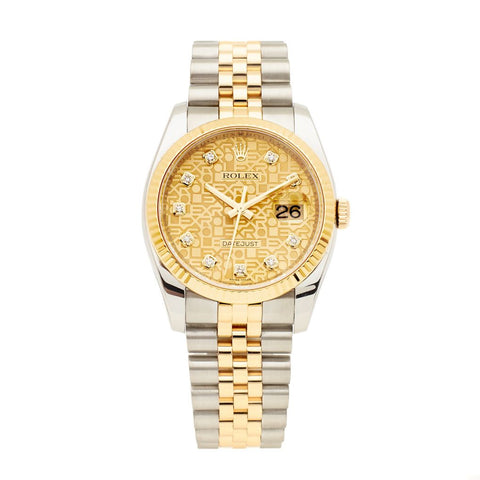 Gent’s 18kt yellow gold and stainless steel Rolex Oyster Perpetual Datejust wristwatch. Integrated two-tone Jubilee bracelet. Fixed 18kt yellow gold fluted bezel. Champagne jubilee dial with 10 diamond-set hour markers; date aperture at the three o’clock position. 36mm case diameter. Automatic movement. Sapphire crystal. Originally manufactured in 2010; V Serial. Reference #: 116233 .