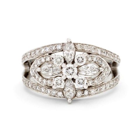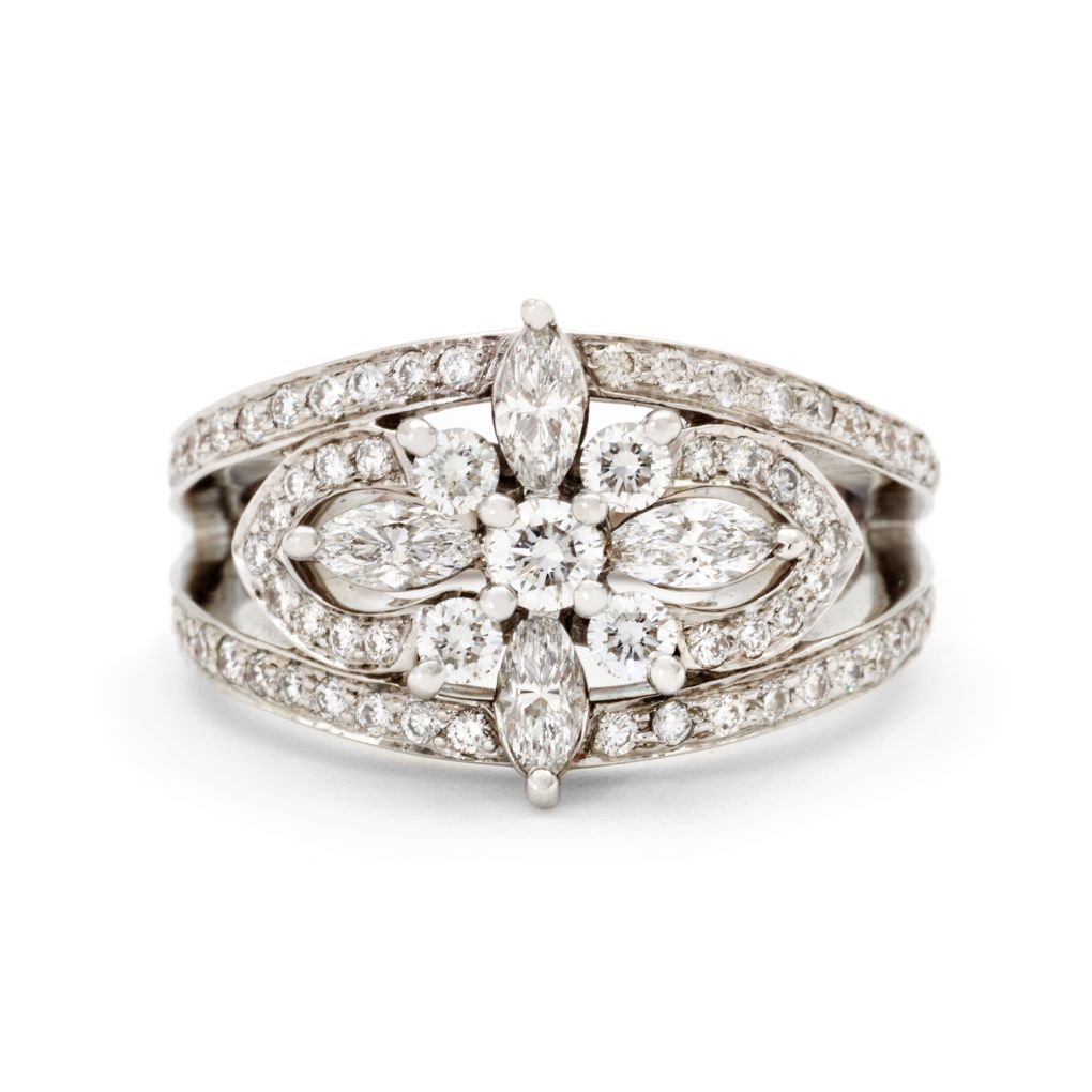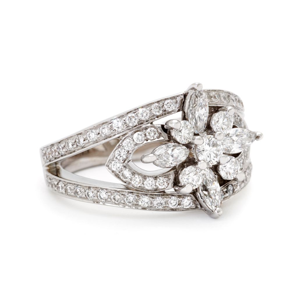 Ladies Kwiat 18kt white gold diamond ring featuring 4 marquise-cut diamonds weighing 0.56 total carat weight. The ring is further enhanced by 75 round brilliant cut diamonds. All of these diamonds are (SI-1) in clarity and (G-H) in color. This is a product created exclusively for Birks Jewellers.