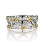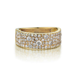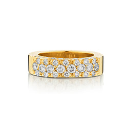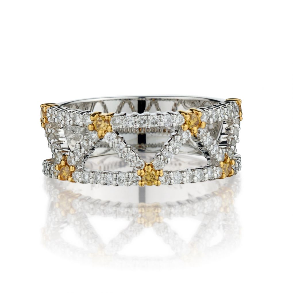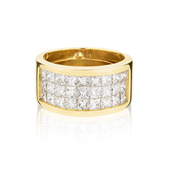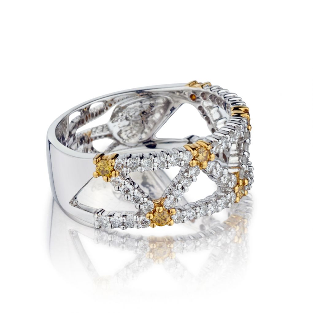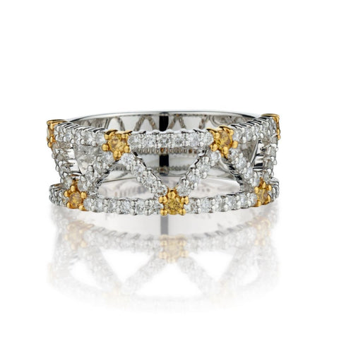 Ladies 18kt yellow gold diamond "V" band set with diamonds This ring features 69 x 0.63 total carat weight of Brilliant cut diamonds of (SI) in clarity and (H) in colour. Also featuring 7 x treated yellow diamonds. Current finger size 6-1/2. This ring can be resized. 7mm (W).