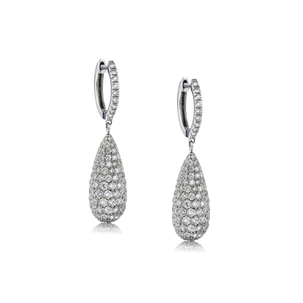 Ladies 18kt white gold diamond pendant drop earrings featuring 3.75 total carat weight of pave' set diamonds of (SI) in clarity and (G-H) in colour. Teardrop. 32mm (L)