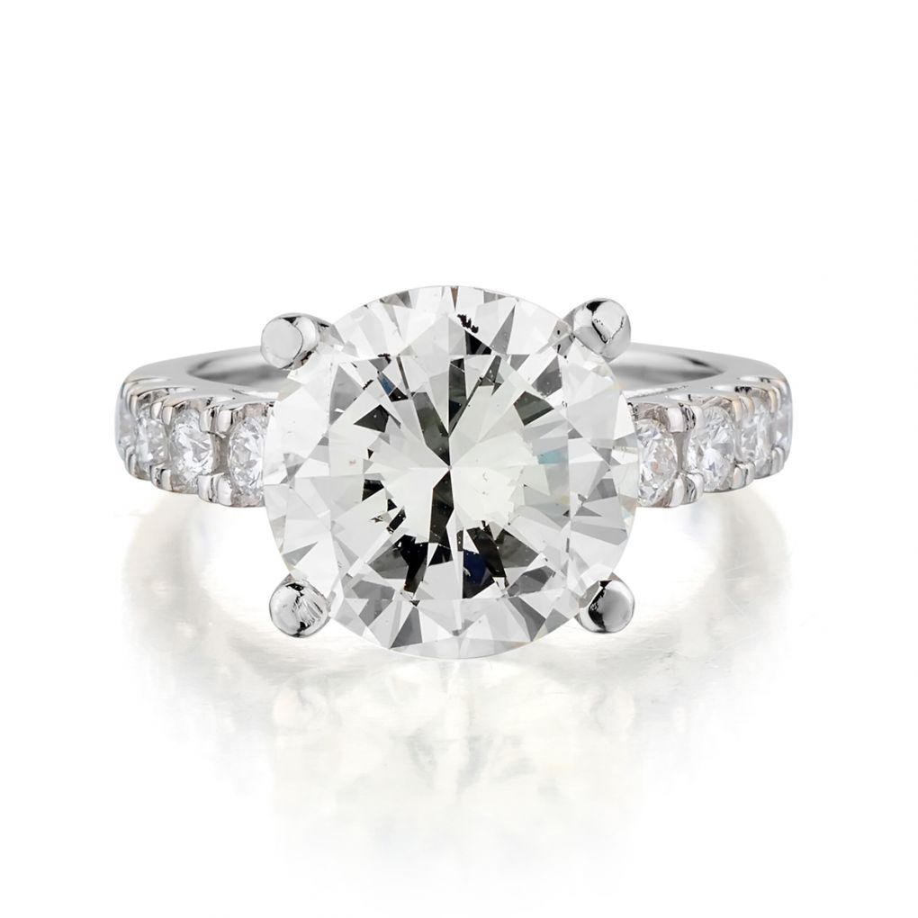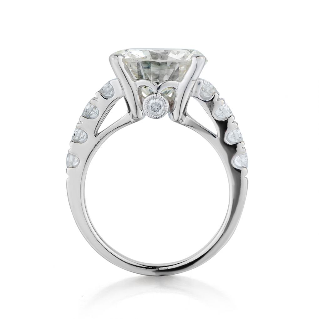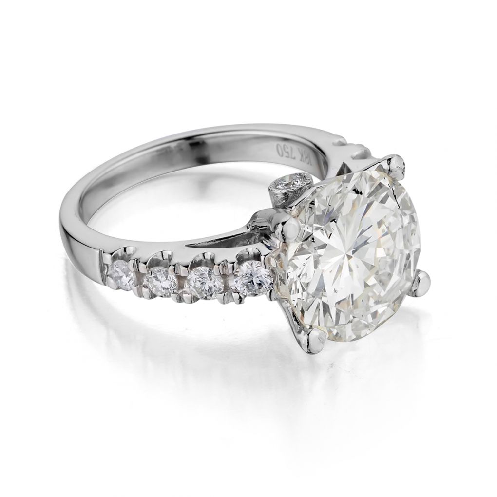 Ladies 18kt white gold diamond ring featuring a Brilliant cut diamonds weighing 4.90 carat weight of (SI-1) in clarity and (L-M) in colour. Also featuring 10 x 0.45 total carat weight of Brilliant cut diamonds . Current finger size 6. This ring can be resized.