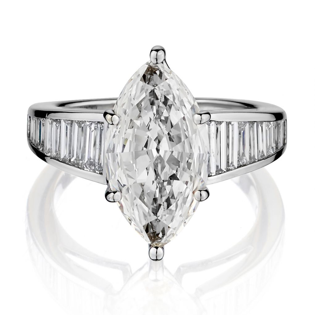 Ladies Beautiful 18Kt white gold diamond ring featuring a Marquise cut diamond weighing 2.85 Carat weight of (VS) in clarity and (J) in color.Sides of the centre diamond are set with 1.00 carat total weight of Baguette cut diamonds . Finger size 6-3/4. This ring can be resized.