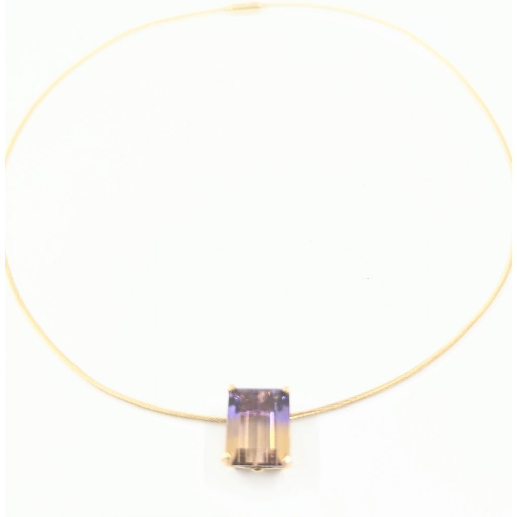 Ladies 18kt Yellow gold pendant featuring an Emerald cut Ametrine.(It combines the purple of the amethyst and the golden colour of the Citrine combined).The Ametrine measures 14mm x 11mm. This pendant is attached to an 18kt yellow gold choker measuring 16 inches.