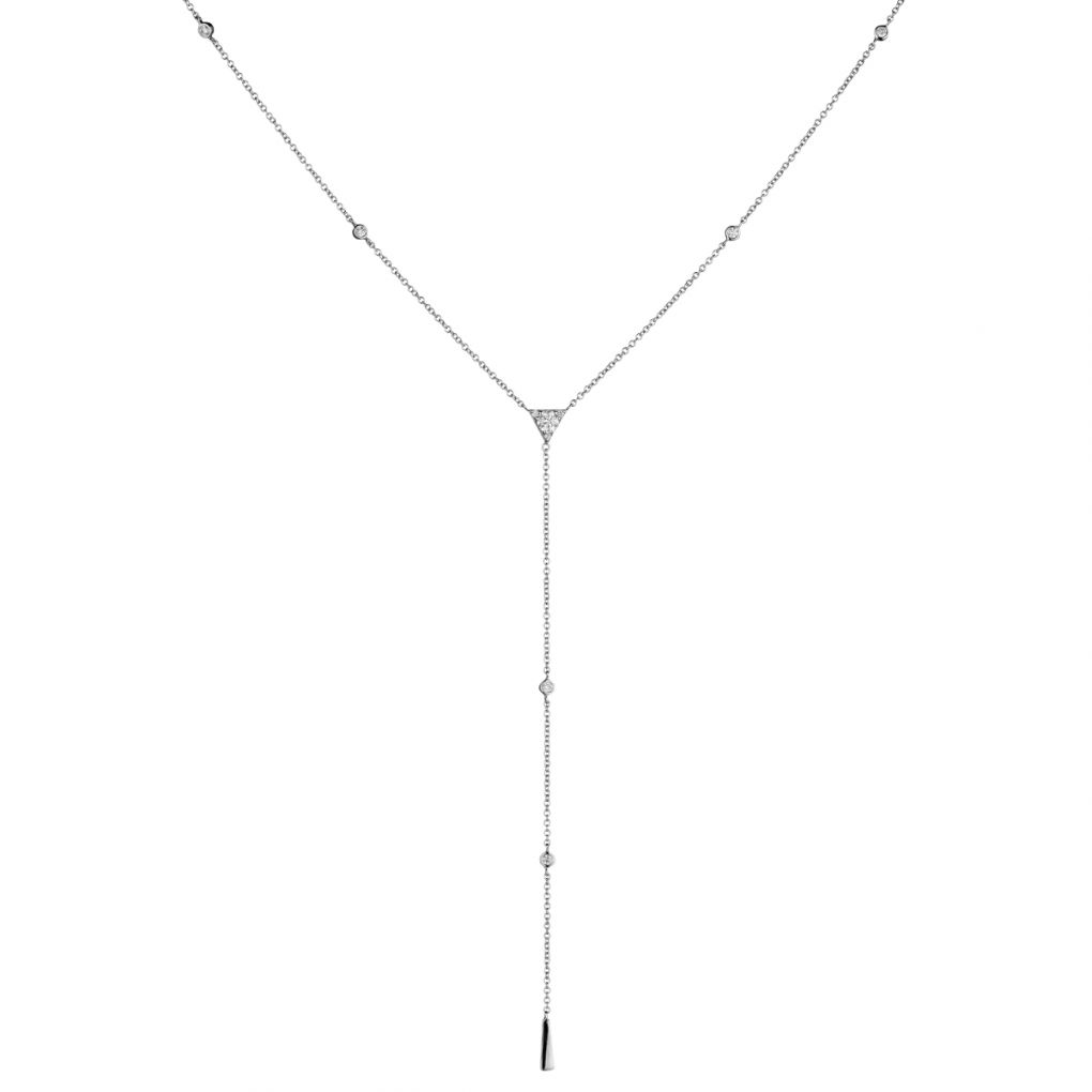 "Hearts on Fire" Triplicity Triangle Lariat Necklace in 18kt white gold. This pendant features 0.43 total carat weight of Brilliant cut diamonds. Elegant and delicate triangle design. This pendant can be worn in different lengths.