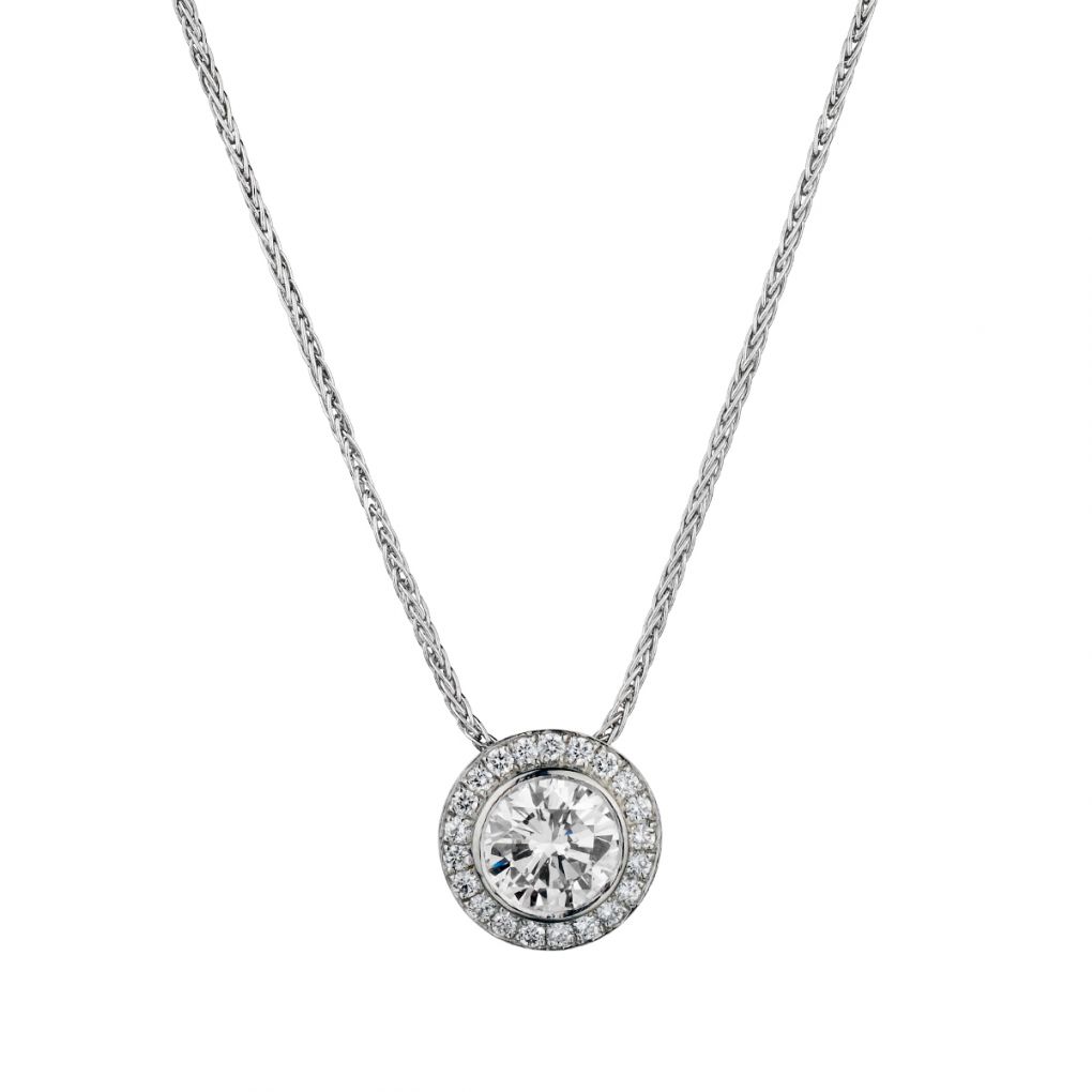 Ladies custom made Platinum and diamond slide pendant featuring a Brilliant cut diamond weighing 1.25 carat weight of (SI-1) in clarity and (G) in colour. This diamond is surrounded by 21 x 0.25 total carat weight of Brilliant cut diamonds of (VVS-VS) in clarity and (F-G) in colour. 18"chain platinum chain with lobster clasp closure.