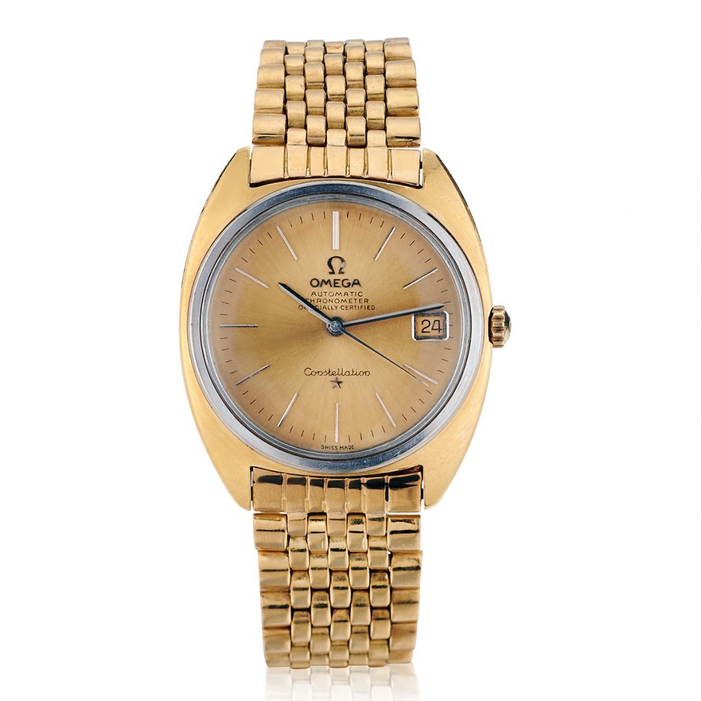 Gents Omega Constellation "C" in 18kt yellow gold. Original 18kt yellow gold Omega band with fold over clasp. 34mm case size.Automatic. Plexiglass glass. Gold dial with baton hands. Date.Weight is 117grams. 24 jewels.Good condition. Circa 1970's