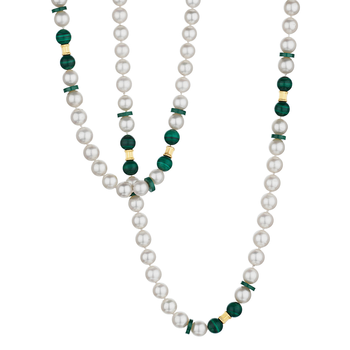 • Opera Length Pearl and Malachite Strand. 8.5mm Pearls
