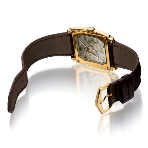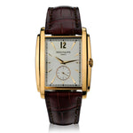 Mens Patek Philippe Gondola wristwatch in 18kt yellow gold. Brown crocodile strap with 18kt yellow gold Patek Philippe tang. 33mm x 43mm case size. Manual winding. Silver dial with stick markers. Sweep subsidary seconds hand. Exhibition back. Power reserve:44hrs. Water resistance: 3 ATM. Circa 2017.