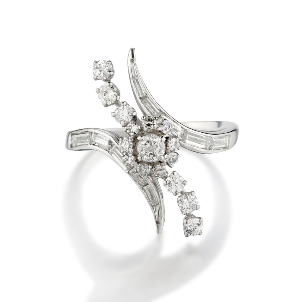 Platinum Custom made diamond ring featuring 1.00 total carat weight of Brilliant cut and Baguette cut diamonds of (VS-SI) in clarity and (G-H) in colour. Unique design. Measurements: 26mm (L) x 9mm (W). Current finger size 7-1/2. This ring can be resized. Circa 1950's