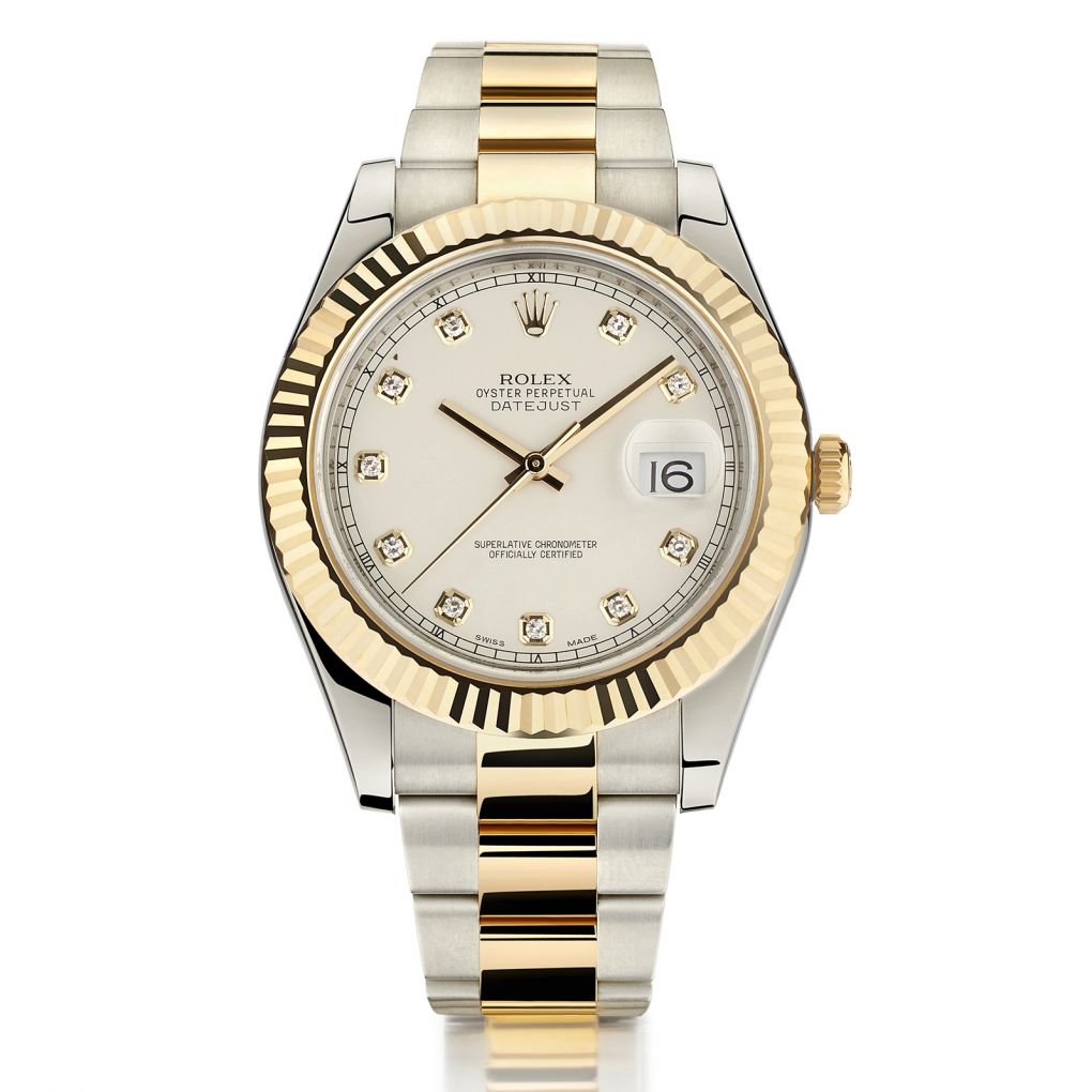 Gent’s 18kt yellow gold and stainless steel Rolex Oyster Perpetual Datejust II wristwatch. Integrated two-tone Oyster bracelet with Oysterlock clasp. Cream-colored dial with diamond hour markers; Date aperture at the three o’clock position. Fixed 18kt yellow gold fluted bezel. 41mm case diameter. Automatic movement. Sapphire crystal. Circa 2015.Ref.#:116333.