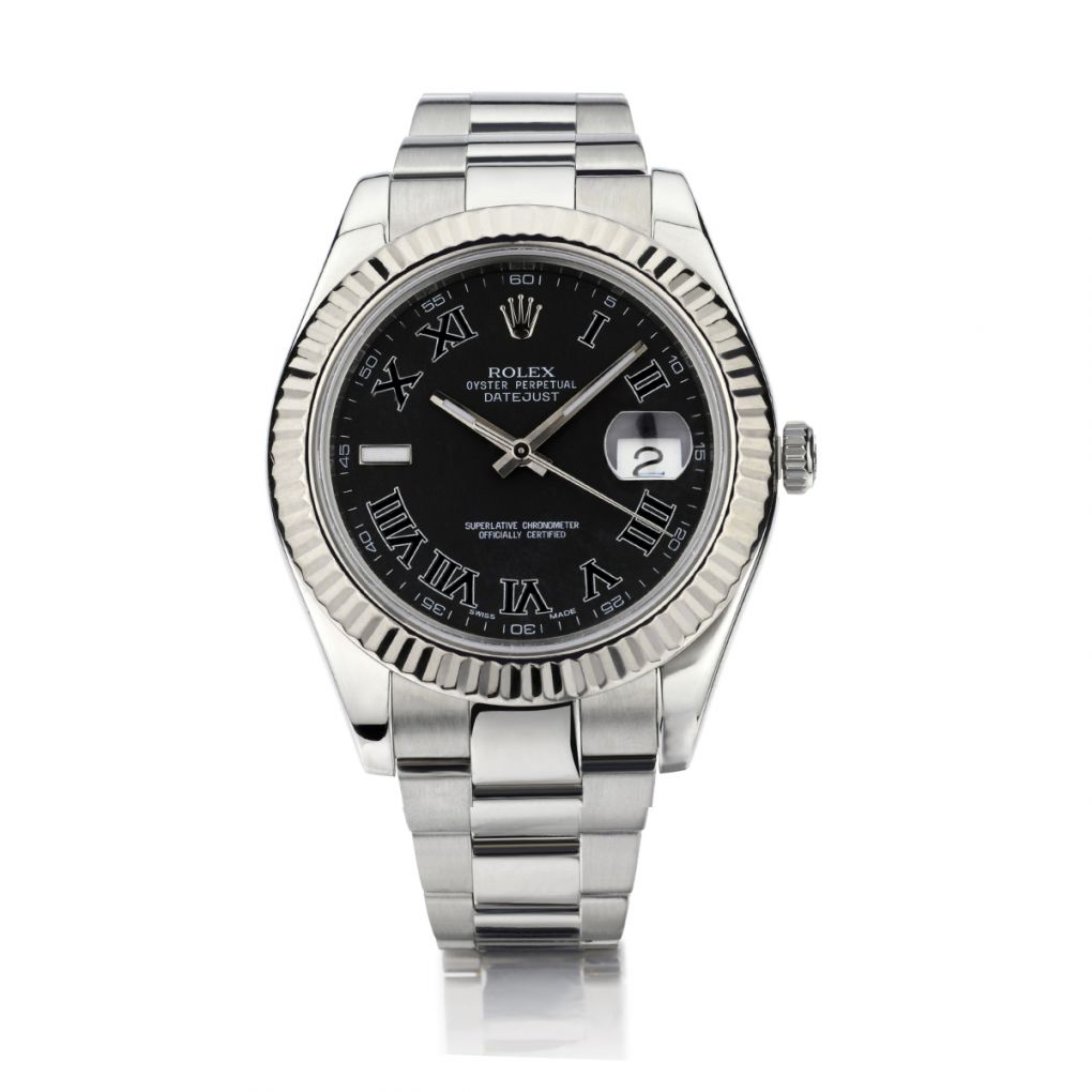 Gents stainless steel Rolex Oyster Perpetual Datejust II wristwatch. 18kt white gold fluted bezel. Integrated stainless steel Oyster bracelet. 41mm case diameter. Automatic movement. Black dial with arabic numeral hour markers. Sapphire crystal. Year 2010. Reference #: 116334.