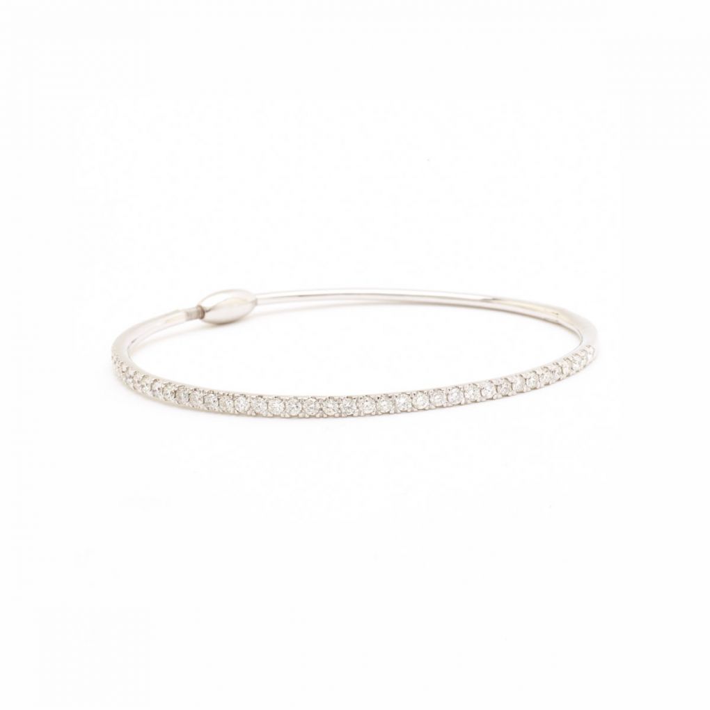 Ladies 18KT white gold bangle with (37) round brilliant cut diamonds weighing 1.07cts total weight of (SI) in clarity and (G) in color. The bangle has a special screw-down clasp for extra security.
