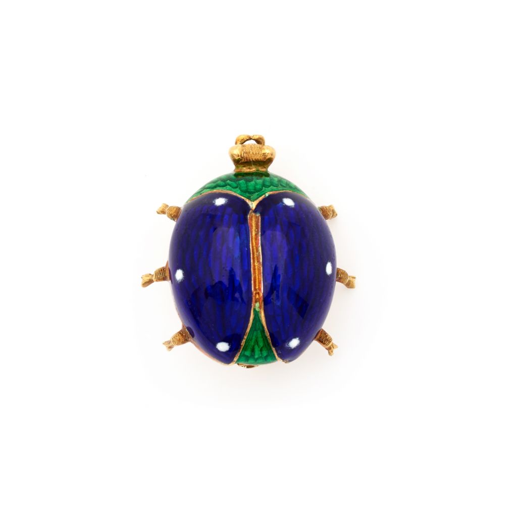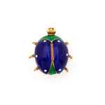 An adorable 18kt yellow gold and enamel ladybug brooch in beautiful royal blue and bright green with white spots. 3/4 inch tall. An adorable matching ladybug brooch sold separately.