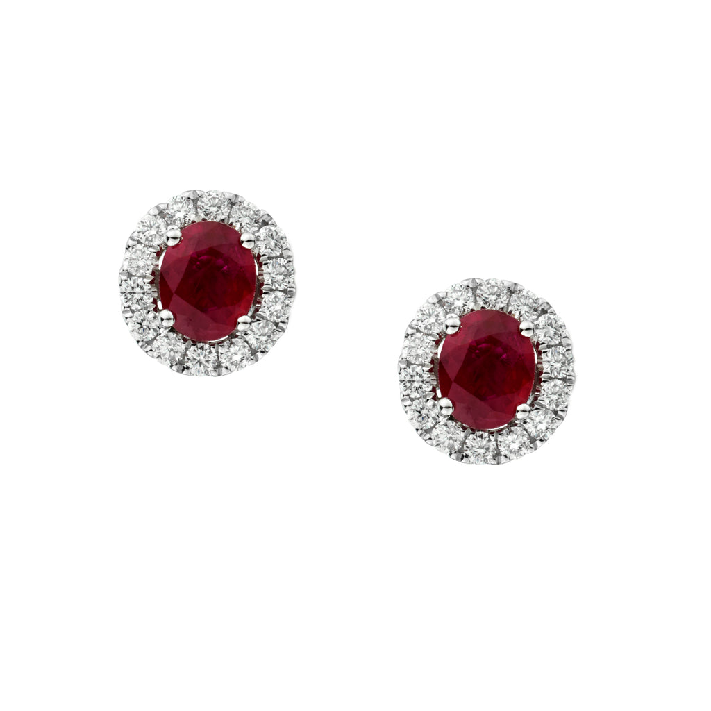 Ladies 18kt white gold Ruby and Diamond stud earrings consisting of 2 x 1.00 total carat weight of Oval Rubies and 0.35 total carat weight of Brilliant cut diamonds.Measuring:8mm(L) x 8mm (W) .Post and butterfly closure.