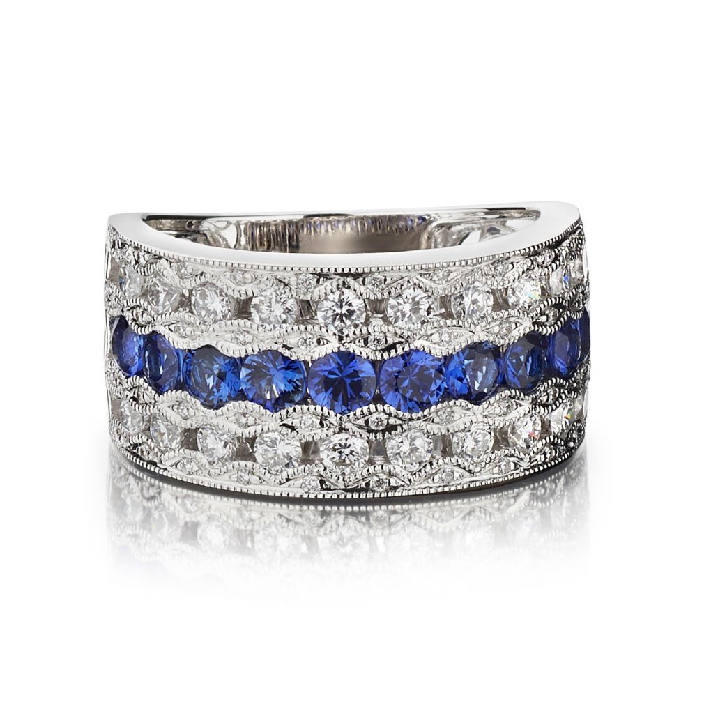 Ladies beautiful 18kt white gold and diamond band featuring (10) blue sapphires weighing approximately 1.00 carat total weight; enhanced by a row of Round Brilliant cut diamonds on the top and bottom, weighing 0.75 carat total weight of (VS-SI) in clarity and (G-H) in color. The sapphires and diamonds go halfway around the band; 10mm wide. Currently a size 6 1/2 but can be resized.