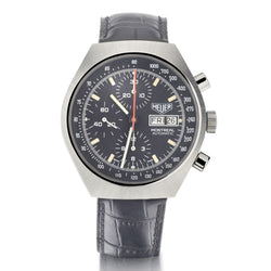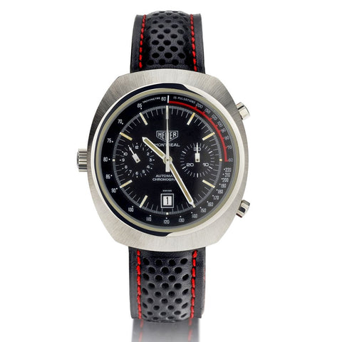 Gents rare Heuer Montreal vintage stainless steel wristwatch. Featured on a Tag heuer black leather strap with red stitching, with an original Heuer tang clasp. Black dial with red pulsations and cream/warm luminous index hour markers and hands; date aperture at the 6 o'clock position. Automatic movement; chromatic micro-rotor movement; 12 caliber. Sapphire  crystal. 42mm x 46mm case diameter. Circa 1970's. Reference #: 110.503NC.