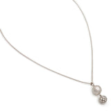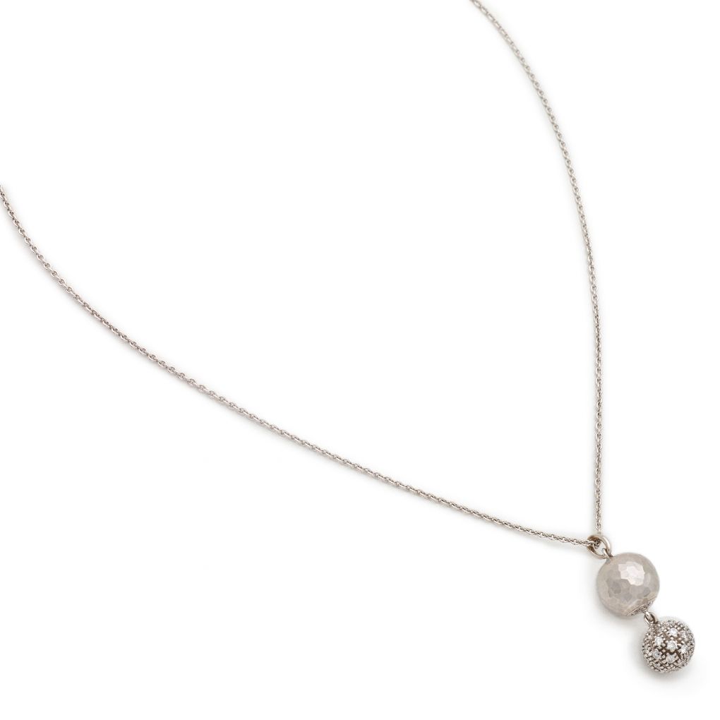 Ladies elegant 18kt white gold Tiffany & Co. hand-hammered dangle ball pendant necklace by Paloma Picasso. This pendant features a white gold hammered ball, along with a pavé-set round brilliant cut diamonds ball. Signed Italy 750. 16″ in length. No longer in production.