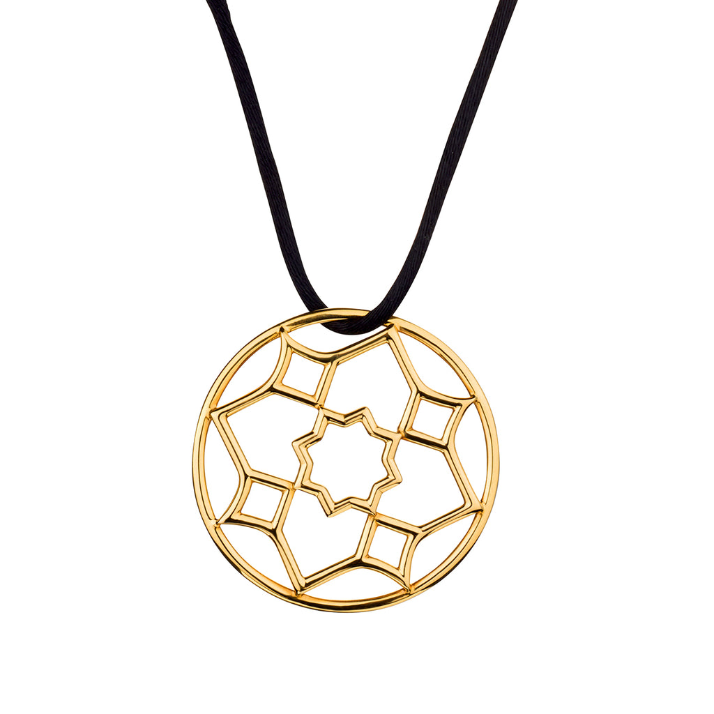Tiffany & Co 18kt yellow gold Zellige medallion by Paloma Picasso. The Iberian Peninsula was the centre of Zellige. This 18kt yellow gold medallion embodies the Islamic,Roman and Byzantine tile patterns. It's featured on a black chord which can be worn at several different lengths.