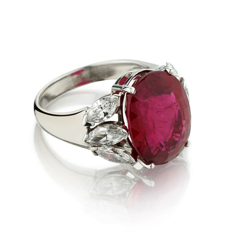 Ladies custom made 18kt white gold Red Tourmaline and Diamond cocktail ring. This ring features an oval cut red tourmaline weighing 9.82 carat weight. Measuring 15.33 x 12.00 x7.64mm. Also featuring 6 x Natural Marquise cut diamonds weighing 1.38 total carat weight of (VS-SI) in clarity and (F-G) in colour. Current finger size:7-3/4. This ring can be resized.