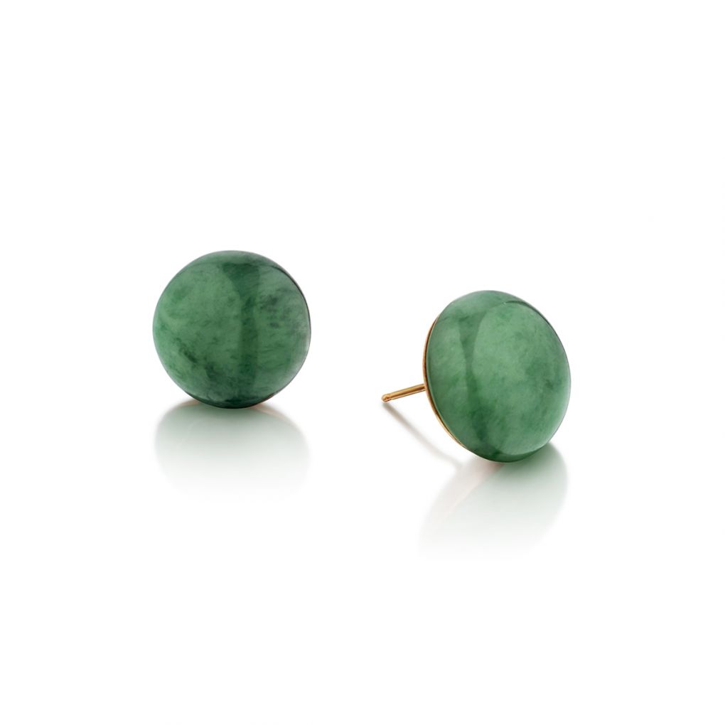 Ladies vintage 14kt yellow gold jade button earrings featuring 16mm jade gemstones. Post and butterfly backing.